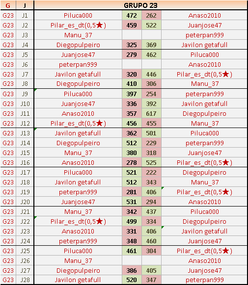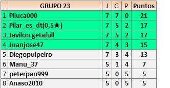 Deja un comentarioEn está página se irán publicando los resultados de las diferentes partidas, siendo ambos jugadores responsables de subirlos o de comprobar que ya hayan sido publicados insertando un COMENTARIO en la parte inferior de la pantalla (opción “Deja tu comentario”), indicando el nombre de los dos jugadores y los puntos obtenidos en la partida.