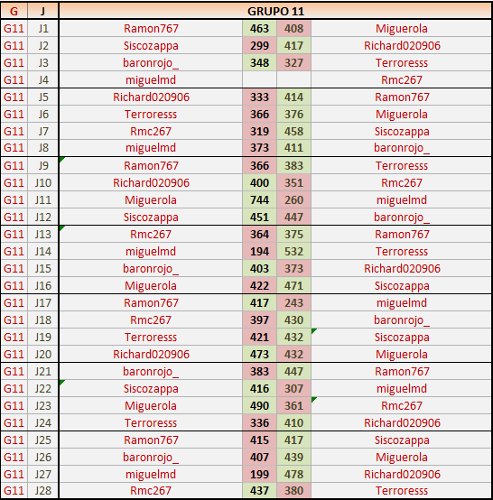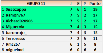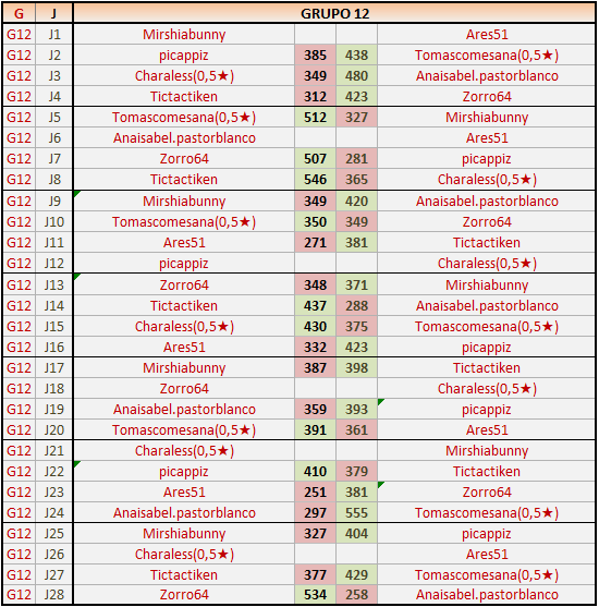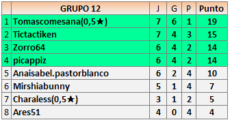 Deja un comentarioEn está página se irán publicando los resultados de las diferentes partidas, siendo ambos jugadores responsables de subirlos o de comprobar que ya hayan sido publicados insertando un COMENTARIO en la parte inferior de la pantalla (opción “Deja tu comentario”), indicando el nombre de los dos jugadores y los puntos obtenidos en la partida.
