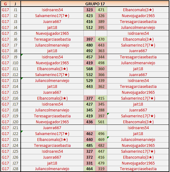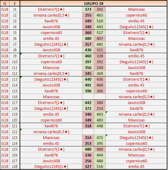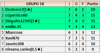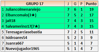 Deja un comentarioEn está página se irán publicando los resultados de las diferentes partidas, siendo ambos jugadores responsables de subirlos o de comprobar que ya hayan sido publicados insertando un COMENTARIO en la parte inferior de la pantalla (opción “Deja tu comentario”), indicando el nombre de los dos jugadores y los puntos obtenidos en la partida.