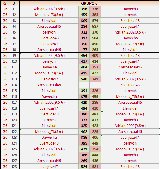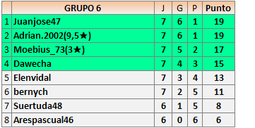 Deja un comentarioEn está página se irán publicando los resultados de las diferentes partidas, siendo ambos jugadores responsables de subirlos o de comprobar que ya hayan sido publicados insertando un COMENTARIO en la parte inferior de la pantalla (opción “Deja tu comentario”), indicando el nombre de los dos jugadores y los puntos obtenidos en la partida.