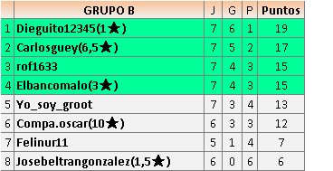 He tenido un problema cn las puntuaciones y se me han borrado le he mandado un mensaje a mis oponente para q me manden los resultados q de momento gane a dawecha, juliancolmenarviejo, ares51, bettyfar, juanjose20002005 perdí cn Petitm y solo me queda Norgio2 gracias y perdonad