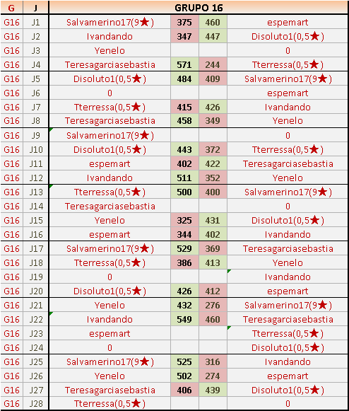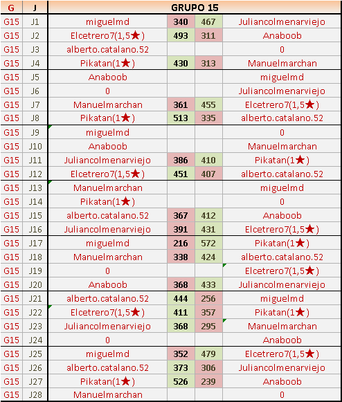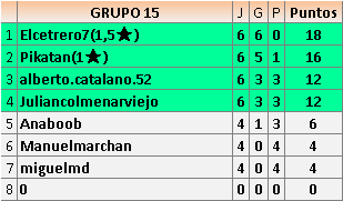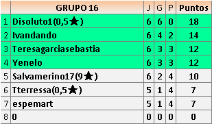 Deja un comentarioEn está página se irán publicando los resultados de las diferentes partidas, siendo ambos jugadores responsables de subirlos o de comprobar que ya hayan sido publicados insertando un COMENTARIO en la parte inferior de la pantalla (opción “Deja tu comentario”), indicando el nombre de los dos jugadores y los puntos obtenidos en la partida.