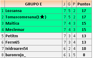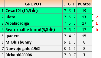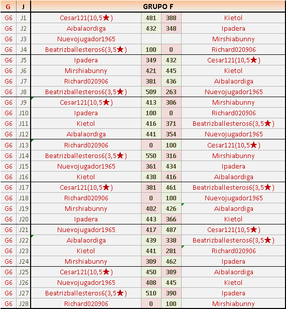 Deja un comentarioEn está página se irán publicando los resultados de las diferentes partidas, siendo ambos jugadores responsables de subirlos o de comprobar que ya hayan sido publicados insertando un COMENTARIO en la parte inferior de la pantalla (opción “Deja tu comentario”), indicando el nombre de los dos jugadores y los puntos obtenidos en la partida.