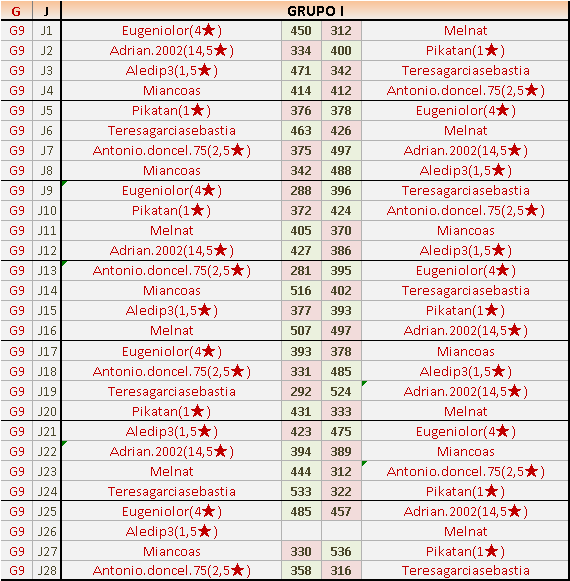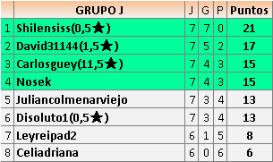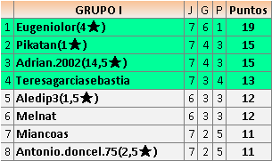 Deja un comentarioEn está página se irán publicando los resultados de las diferentes partidas, siendo ambos jugadores responsables de subirlos o de comprobar que ya hayan sido publicados insertando un COMENTARIO en la parte inferior de la pantalla (opción “Deja tu comentario”), indicando el nombre de los dos jugadores y los puntos obtenidos en la partida.