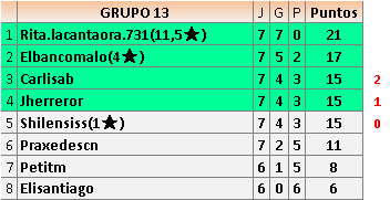 Deja un comentarioEn está página se irán publicando los resultados de las diferentes partidas, siendo ambos jugadores responsables de subirlos o de comprobar que ya hayan sido publicados insertando un COMENTARIO en la parte inferior de la pantalla (opción “Deja tu comentario”), indicando el nombre de los dos jugadores y los puntos obtenidos en la partida.