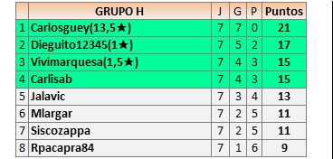 1En está página se irán publicando los resultados de las diferentes partidas, siendo ambos jugadores responsables de subirlos o de comprobar que ya hayan sido publicados insertando un COMENTARIO en la parte inferior de la pantalla (opción “Deja tu comentario”), indicando el nombre de los dos jugadores y los puntos obtenidos en la partida.