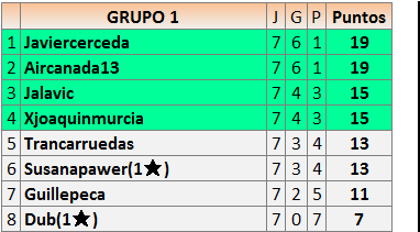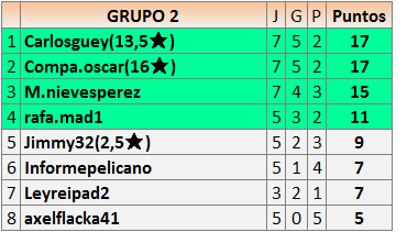 Deja un comentarioEn está página se irán publicando los resultados de las diferentes partidas, siendo ambos jugadores responsables de subirlos o de comprobar que ya hayan sido publicados insertando un COMENTARIO en la parte inferior de la pantalla (opción “Deja tu comentario”), indicando el nombre de los dos jugadores y los puntos obtenidos en la partida.
