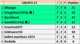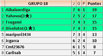 No sé qué habéis hecho esta vez con los resultados, pero los alteráis completamente: no ya los míos, que no me afectan directamente; pero sí otros que modificarían de forma significativa la clasificación del grupo: por ejemplo, mi resultado con maripuri es justo al revés, yo gano y ella pierde, por lo que ni por asomo lleva 4 victorias, ni el desempate se produciría como decís…
