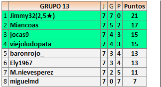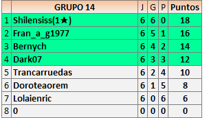 Deja un comentarioEn está página se irán publicando los resultados de las diferentes partidas, siendo ambos jugadores responsables de subirlos o de comprobar que ya hayan sido publicados insertando un COMENTARIO en la parte inferior de la pantalla (opción “Deja tu comentario”), indicando el nombre de los dos jugadores y los puntos obtenidos en la partida.
