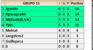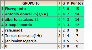 Deja un comentarioEn está página se irán publicando los resultados de las diferentes partidas, siendo ambos jugadores responsables de subirlos o de comprobar que ya hayan sido publicados insertando un COMENTARIO en la parte inferior de la pantalla (opción “Deja tu comentario”), indicando el nombre de los dos jugadores y los puntos obtenidos en la partida.