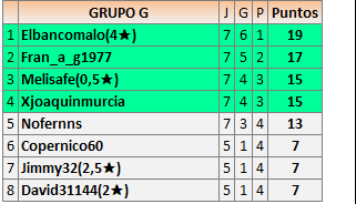 Deja un comentarioEn está página se irán publicando los resultados de las diferentes partidas, siendo ambos jugadores responsables de subirlos o de comprobar que ya hayan sido publicados insertando un COMENTARIO en la parte inferior de la pantalla (opción “Deja tu comentario”), indicando el nombre de los dos jugadores y los puntos obtenidos en la partida.