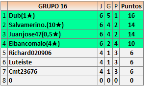 Deja un comentarioEn está página se irán publicando los resultados de las diferentes partidas, siendo ambos jugadores responsables de subirlos o de comprobar que ya hayan sido publicados insertando un COMENTARIO en la parte inferior de la pantalla (opción “Deja tu comentario”), indicando el nombre de los dos jugadores y los puntos obtenidos en la partida.