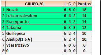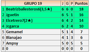 Deja un comentarioEn está página se irán publicando los resultados de las diferentes partidas, siendo ambos jugadores responsables de subirlos o de comprobar que ya hayan sido publicados insertando un COMENTARIO en la parte inferior de la pantalla (opción “Deja tu comentario”), indicando el nombre de los dos jugadores y los puntos obtenidos en la partida.
