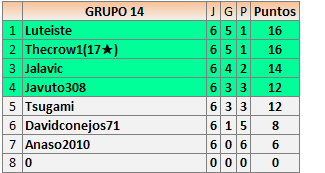 Deja un comentarioEn está página se irán publicando los resultados de las diferentes partidas, siendo ambos jugadores responsables de subirlos o de comprobar que ya hayan sido publicados insertando un COMENTARIO en la parte inferior de la pantalla (opción “Deja tu comentario”), indicando el nombre de los dos jugadores y los puntos obtenidos en la partida.