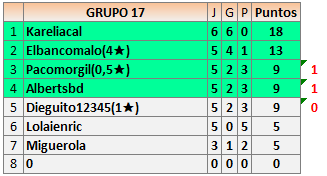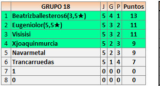 Deja un comentarioEn está página se irán publicando los resultados de las diferentes partidas, siendo ambos jugadores responsables de subirlos o de comprobar que ya hayan sido publicados insertando un COMENTARIO en la parte inferior de la pantalla (opción “Deja tu comentario”), indicando el nombre de los dos jugadores y los puntos obtenidos en la partida.