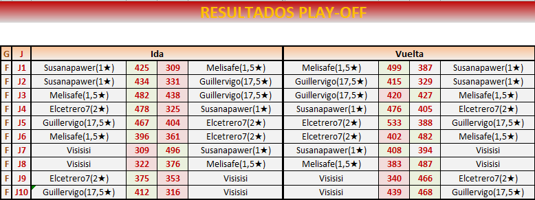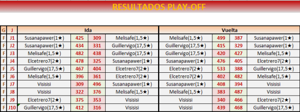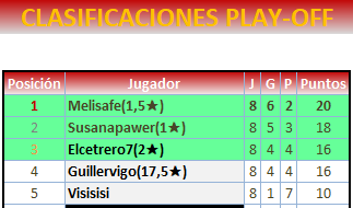 Igualmente felicitar a Elisa que está muy fina, y agradecer a Guille, a Susana (que también mereció ganar) y Visisisi (el siguiente te desquitas) la cordialidad. Ha sido un buen play off, agradable y reñido.