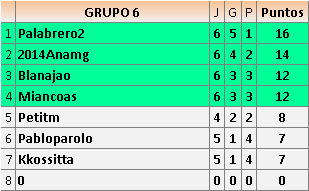 Deja un comentarioEn está página se irán publicando los resultados de las diferentes partidas, siendo ambos jugadores responsables de subirlos o de comprobar que ya hayan sido publicados insertando un COMENTARIO en la parte inferior de la pantalla (opción “Deja tu comentario”), indicando el nombre de los dos jugadores y los puntos obtenidos en la partida.
