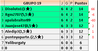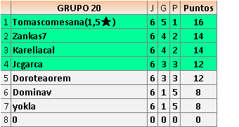 Deja un comentarioEn está página se irán publicando los resultados de las diferentes partidas, siendo ambos jugadores responsables de subirlos o de comprobar que ya hayan sido publicados insertando un COMENTARIO en la parte inferior de la pantalla (opción “Deja tu comentario”), indicando el nombre de los dos jugadores y los puntos obtenidos en la partida.