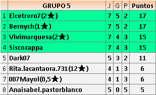 HEMOS INCLUIDO A UN JUGADOR NUEVO EN EL GRUPO 6. SU NICK ES KEDADA. TENERLE EN CUENTA PARA RETAR Y CONFIRMAR SU RETO. GRACIAS.
