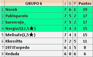 HEMOS INCLUIDO A UN JUGADOR NUEVO EN EL GRUPO 6. SU NICK ES KEDADA. TENERLE EN CUENTA PARA RETAR Y CONFIRMAR SU RETO. GRACIAS.