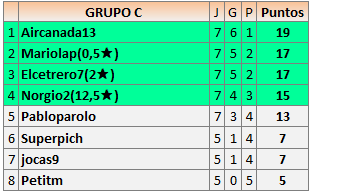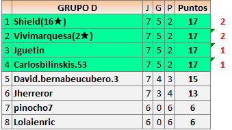 Deja un comentarioEn está página se irán publicando los resultados de las diferentes partidas, siendo ambos jugadores responsables de subirlos o de comprobar que ya hayan sido publicados insertando un COMENTARIO en la parte inferior de la pantalla (opción “Deja tu comentario”), indicando el nombre de los dos jugadores y los puntos obtenidos en la partida.