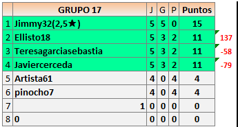 Deja un comentarioEn está página se irán publicando los resultados de las diferentes partidas, siendo ambos jugadores responsables de subirlos o de comprobar que ya hayan sido publicados insertando un COMENTARIO en la parte inferior de la pantalla (opción “Deja tu comentario”), indicando el nombre de los dos jugadores y los puntos obtenidos en la partida.