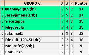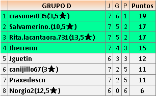 Deja un comentarioEn está página se irán publicando los resultados de las diferentes partidas, siendo ambos jugadores responsables de subirlos o de comprobar que ya hayan sido publicados insertando un COMENTARIO en la parte inferior de la pantalla (opción “Deja tu comentario”), indicando el nombre de los dos jugadores y los puntos obtenidos en la partida.