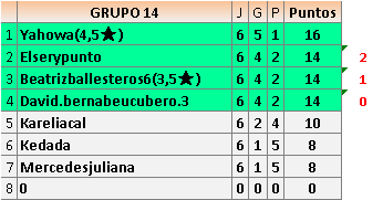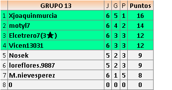 Deja un comentarioEn está página se irán publicando los resultados de las diferentes partidas, siendo ambos jugadores responsables de subirlos o de comprobar que ya hayan sido publicados insertando un COMENTARIO en la parte inferior de la pantalla (opción “Deja tu comentario”), indicando el nombre de los dos jugadores y los puntos obtenidos en la partida.