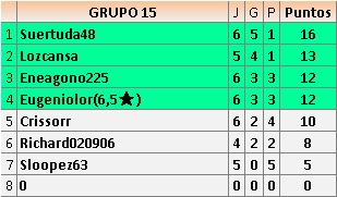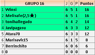 Deja un comentarioEn está página se irán publicando los resultados de las diferentes partidas, siendo ambos jugadores responsables de subirlos o de comprobar que ya hayan sido publicados insertando un COMENTARIO en la parte inferior de la pantalla (opción “Deja tu comentario”), indicando el nombre de los dos jugadores y los puntos obtenidos en la partida.