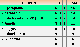 Deja un comentarioEn está página se irán publicando los resultados de las diferentes partidas, siendo ambos jugadores responsables de subirlos o de comprobar que ya hayan sido publicados insertando un COMENTARIO en la parte inferior de la pantalla (opción “Deja tu comentario”), indicando el nombre de los dos jugadores y los puntos obtenidos en la partida.