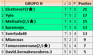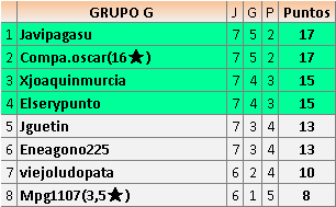 Deja un comentarioEn está página se irán publicando los resultados de las diferentes partidas, siendo ambos jugadores responsables de subirlos o de comprobar que ya hayan sido publicados insertando un COMENTARIO en la parte inferior de la pantalla (opción “Deja tu comentario”), indicando el nombre de los dos jugadores y los puntos obtenidos en la partida.