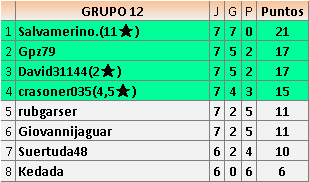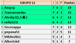 Deja un comentarioEn está página se irán publicando los resultados de las diferentes partidas, siendo ambos jugadores responsables de subirlos o de comprobar que ya hayan sido publicados insertando un COMENTARIO en la parte inferior de la pantalla (opción “Deja tu comentario”), indicando el nombre de los dos jugadores y los puntos obtenidos en la partida.