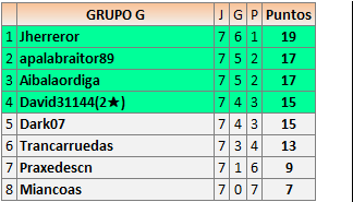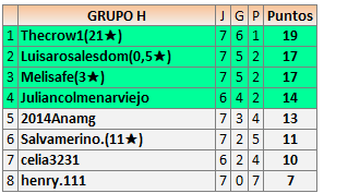 Deja un comentarioEn está página se irán publicando los resultados de las diferentes partidas, siendo ambos jugadores responsables de subirlos o de comprobar que ya hayan sido publicados insertando un COMENTARIO en la parte inferior de la pantalla (opción “Deja tu comentario”), indicando el nombre de los dos jugadores y los puntos obtenidos en la partida.