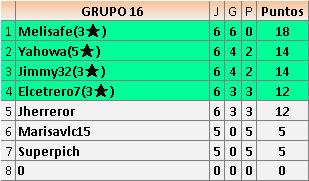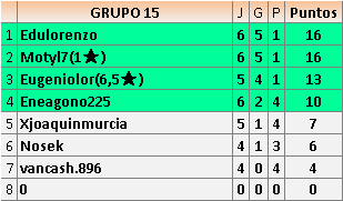 Deja un comentarioEn está página se irán publicando los resultados de las diferentes partidas, siendo ambos jugadores responsables de subirlos o de comprobar que ya hayan sido publicados insertando un COMENTARIO en la parte inferior de la pantalla (opción “Deja tu comentario”), indicando el nombre de los dos jugadores y los puntos obtenidos en la partida.