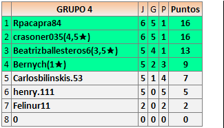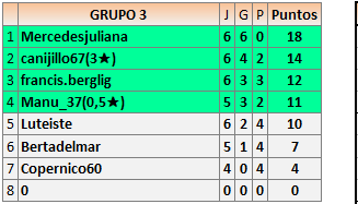 Deja un comentarioEn está página se irán publicando los resultados de las diferentes partidas, siendo ambos jugadores responsables de subirlos o de comprobar que ya hayan sido publicados insertando un COMENTARIO en la parte inferior de la pantalla (opción “Deja tu comentario”), indicando el nombre de los dos jugadores y los puntos obtenidos en la partida.