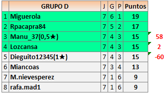Deja un comentarioEn está página se irán publicando los resultados de las diferentes partidas, siendo ambos jugadores responsables de subirlos o de comprobar que ya hayan sido publicados insertando un COMENTARIO en la parte inferior de la pantalla (opción “Deja tu comentario”), indicando el nombre de los dos jugadores y los puntos obtenidos en la partida.
