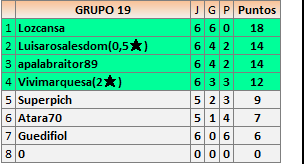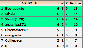 Deja un comentarioEn está página se irán publicando los resultados de las diferentes partidas, siendo ambos jugadores responsables de subirlos o de comprobar que ya hayan sido publicados insertando un COMENTARIO en la parte inferior de la pantalla (opción “Deja tu comentario”), indicando el nombre de los dos jugadores y los puntos obtenidos en la partida.