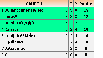 Deja un comentarioEn está página se irán publicando los resultados de las diferentes partidas, siendo ambos jugadores responsables de subirlos o de comprobar que ya hayan sido publicados insertando un COMENTARIO en la parte inferior de la pantalla (opción “Deja tu comentario”), indicando el nombre de los dos jugadores y los puntos obtenidos en la partida.