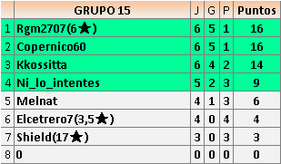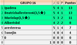 Deja un comentarioEn está página se irán publicando los resultados de las diferentes partidas, siendo ambos jugadores responsables de subirlos o de comprobar que ya hayan sido publicados insertando un COMENTARIO en la parte inferior de la pantalla (opción “Deja tu comentario”), indicando el nombre de los dos jugadores y los puntos obtenidos en la partida.