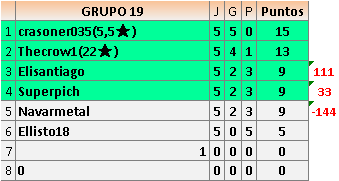 Deja un comentarioEn está página se irán publicando los resultados de las diferentes partidas, siendo ambos jugadores responsables de subirlos o de comprobar que ya hayan sido publicados insertando un COMENTARIO en la parte inferior de la pantalla (opción “Deja tu comentario”), indicando el nombre de los dos jugadores y los puntos obtenidos en la partida.