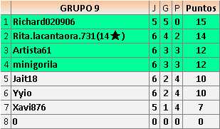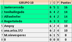 Deja un comentarioEn está página se irán publicando los resultados de las diferentes partidas, siendo ambos jugadores responsables de subirlos o de comprobar que ya hayan sido publicados insertando un COMENTARIO en la parte inferior de la pantalla (opción “Deja tu comentario”), indicando el nombre de los dos jugadores y los puntos obtenidos en la partida.