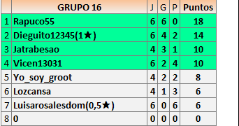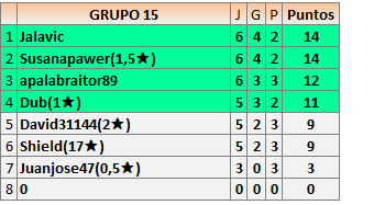 Deja un comentarioEn está página se irán publicando los resultados de las diferentes partidas, siendo ambos jugadores responsables de subirlos o de comprobar que ya hayan sido publicados insertando un COMENTARIO en la parte inferior de la pantalla (opción “Deja tu comentario”), indicando el nombre de los dos jugadores y los puntos obtenidos en la partida.