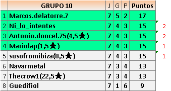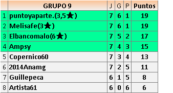 Deja un comentarioEn está página se irán publicando los resultados de las diferentes partidas, siendo ambos jugadores responsables de subirlos o de comprobar que ya hayan sido publicados insertando un COMENTARIO en la parte inferior de la pantalla (opción “Deja tu comentario”), indicando el nombre de los dos jugadores y los puntos obtenidos en la partida.