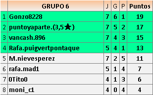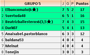 Deja un comentarioEn está página se irán publicando los resultados de las diferentes partidas, siendo ambos jugadores responsables de subirlos o de comprobar que ya hayan sido publicados insertando un COMENTARIO en la parte inferior de la pantalla (opción “Deja tu comentario”), indicando el nombre de los dos jugadores y los puntos obtenidos en la partida.