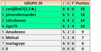 Deja un comentarioEn está página se irán publicando los resultados de las diferentes partidas, siendo ambos jugadores responsables de subirlos o de comprobar que ya hayan sido publicados insertando un COMENTARIO en la parte inferior de la pantalla (opción “Deja tu comentario”), indicando el nombre de los dos jugadores y los puntos obtenidos en la partida.