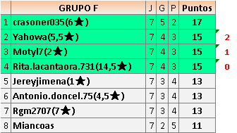 Deja un comentarioEn está página se irán publicando los resultados de las diferentes partidas, siendo ambos jugadores responsables de subirlos o de comprobar que ya hayan sido publicados insertando un COMENTARIO en la parte inferior de la pantalla (opción “Deja tu comentario”), indicando el nombre de los dos jugadores y los puntos obtenidos en la partida.