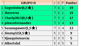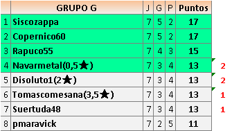 Deja un comentarioEn está página se irán publicando los resultados de las diferentes partidas, siendo ambos jugadores responsables de subirlos o de comprobar que ya hayan sido publicados insertando un COMENTARIO en la parte inferior de la pantalla (opción “Deja tu comentario”), indicando el nombre de los dos jugadores y los puntos obtenidos en la partida.