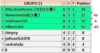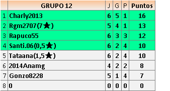 Deja un comentarioEn está página se irán publicando los resultados de las diferentes partidas, siendo ambos jugadores responsables de subirlos o de comprobar que ya hayan sido publicados insertando un COMENTARIO en la parte inferior de la pantalla (opción “Deja tu comentario”), indicando el nombre de los dos jugadores y los puntos obtenidos en la partida.