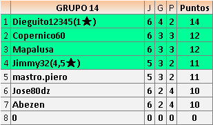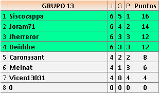 Deja un comentarioEn está página se irán publicando los resultados de las diferentes partidas, siendo ambos jugadores responsables de subirlos o de comprobar que ya hayan sido publicados insertando un COMENTARIO en la parte inferior de la pantalla (opción “Deja tu comentario”), indicando el nombre de los dos jugadores y los puntos obtenidos en la partida.