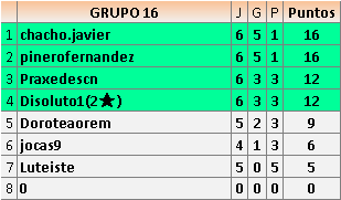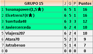 Deja un comentarioEn está página se irán publicando los resultados de las diferentes partidas, siendo ambos jugadores responsables de subirlos o de comprobar que ya hayan sido publicados insertando un COMENTARIO en la parte inferior de la pantalla (opción “Deja tu comentario”), indicando el nombre de los dos jugadores y los puntos obtenidos en la partida.